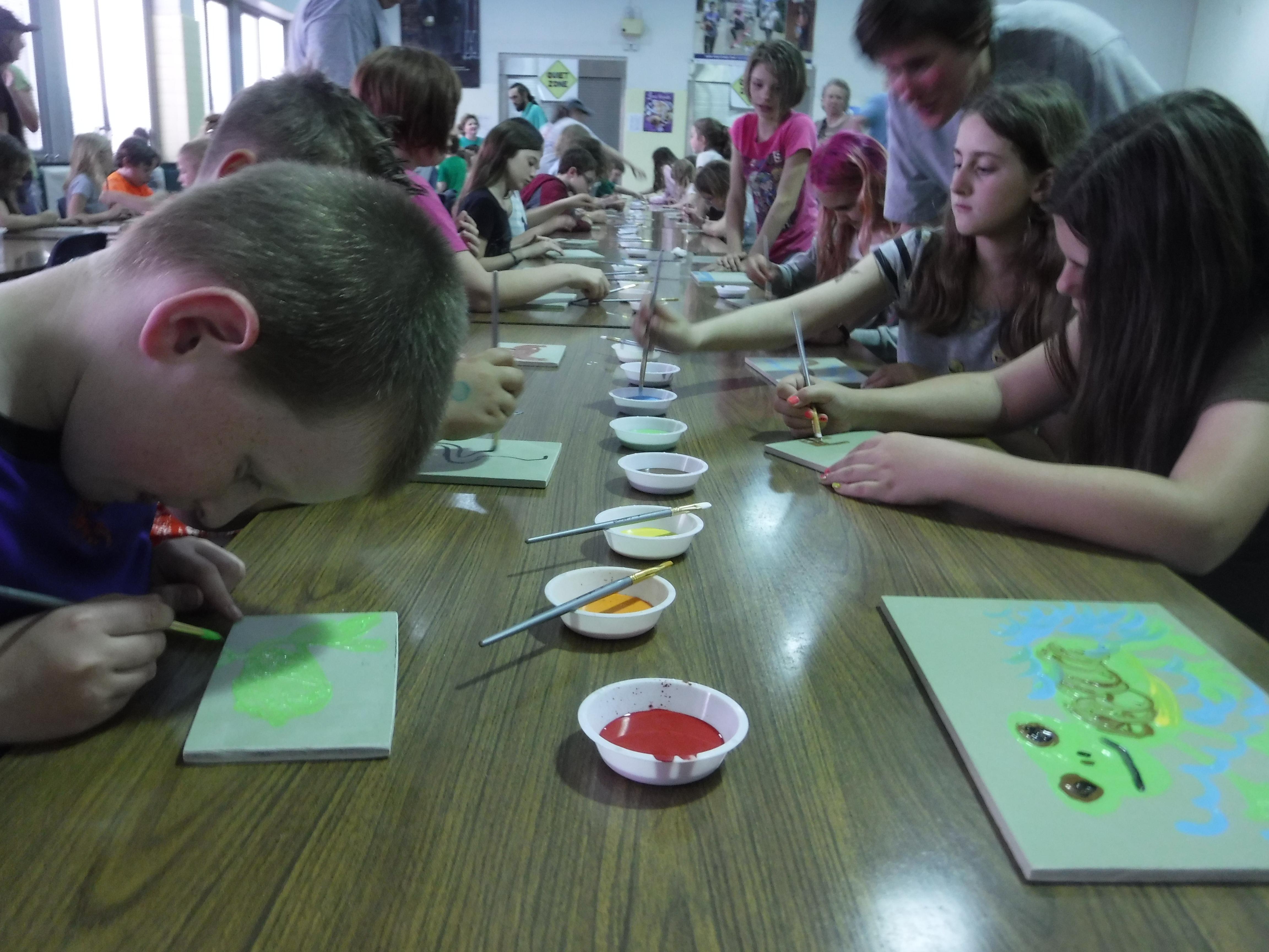 After enjoying a snack of goldfish crackers, students studied posters of animals that live in and around the rivers in Pennsylvania. Then students created river animal art using acrylic paint on cement boards which were donated by Jim Garthe, president of the Standing Stone Trail Club.